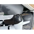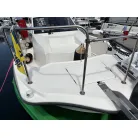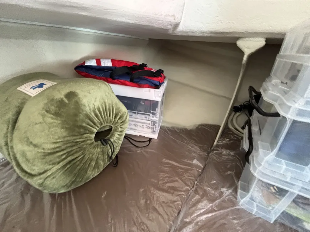 船内バウ側にクッションシートが敷かれており、休憩スペースや収納スペースとして活用できます。