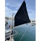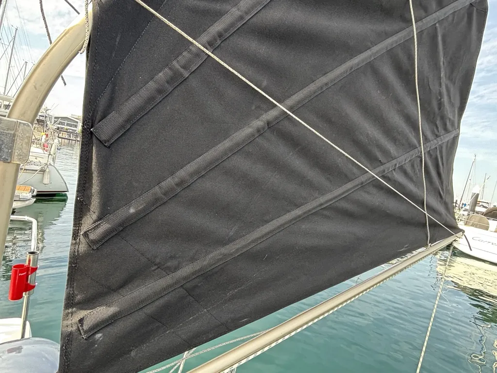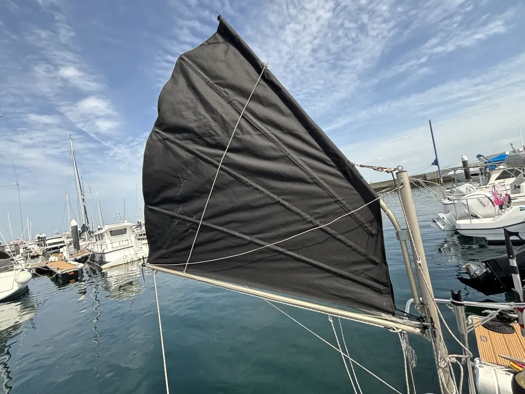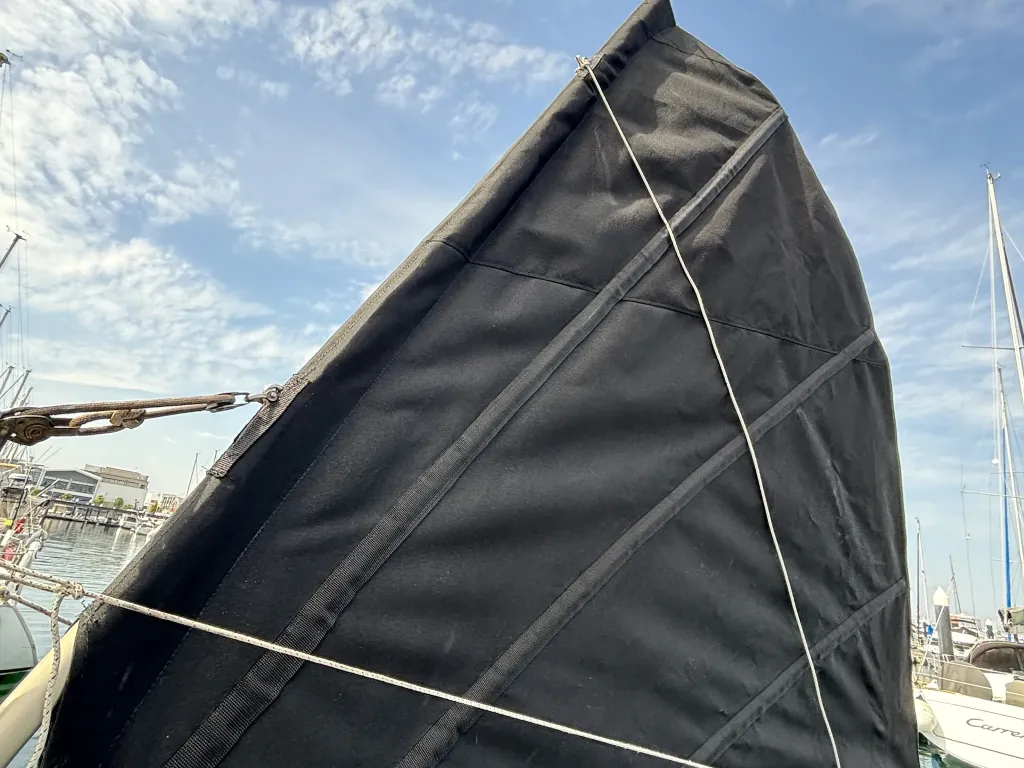 スパンカー: 船尾中央にはスパンカーが装備されています。セイル(帆)は黒色、スパンカーは以前に新しいものに交換しております。