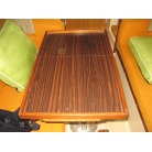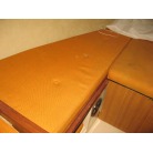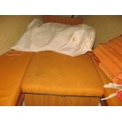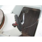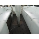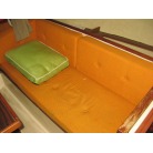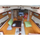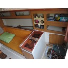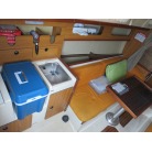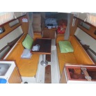 キャビンに入ると左舷にギャレーが装備され、その先が大人3人ほどが座れるシートとなっています。 右舷側にはチャートテーブルが入口付近にあり、その先に大人3人ほどが座れるシートが装備されています。 何れのシートも新艇当時のもので傷みも有りませんが、多少の汚れが見受けられました。